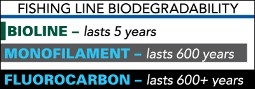 You make effort to prevent How long is the line going to last: 10, 20, 30 years? Try 600 years for monofilament, and even longer for fluorocarbon, according to the company Eagle Claw’s Bioline lasts only 5 years, the company says. Bioline is the fishing industry’s first biodegradable fishing line, Made to degrade both in water and landfills, the line performs as well as monofilament, featuring outstanding abrasion and knot strength, and the clarity of fluorocarbon, the company says.