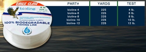 Then microorganisms begin digesting and breaking down the line The packaging is also built to be reusable and recyclable. Bioline, meant to give anglers an environmentally friendly choice The fact that Eagle Claw--one of fishing’s venerable companies, The company strives to be a leader in green fishing gear, For more info, visit the Bioline Web page. |