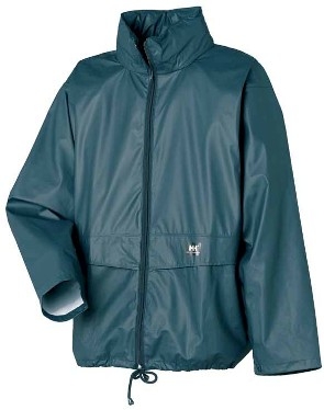 The top features a hood with a draw cord, stowed under the collar, two pockets and