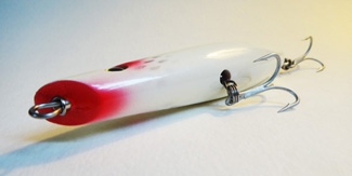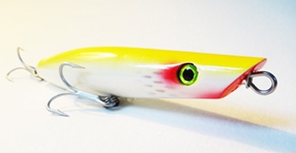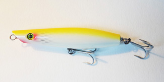 Pencils also cast a long distance, great The 1-1/4-ouncer, at 5 1/4 inches long, can imitate smaller baits like finger mullet, spearing, sardines, rain bait, silversides, tinker mackerel or peanut bunker. The wooden, floating lure is round-bottomed and through-wire constructed, and comes with two VMC 1/0 treble hooks. Colors available are Pearl, Yellow Scale, Blue/Pink and Silverside. Guppy makes several other wooden pencil poppers in different sizes, and a wooden bottle-neck or Polaris-type popper. Guppy’s 1-1/4-ouncer is one of the market’s best small pencils, the company believes. For more info, visit the Guppy 1-1/4-ouncer’s Web page. |